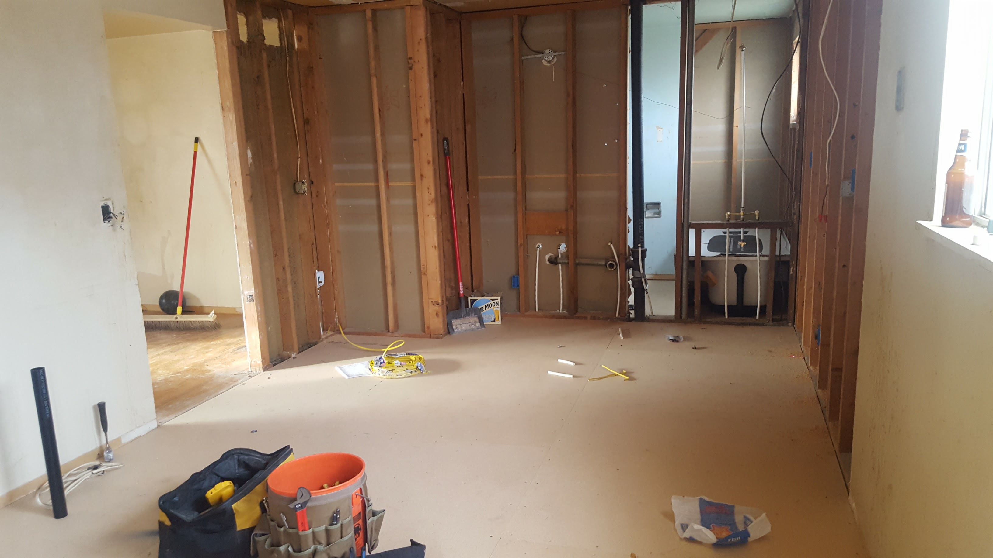 The kitchen has a brand new subfloor and is ready for the new sheet rock, paint, floor & cabinets.
