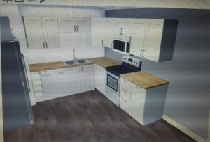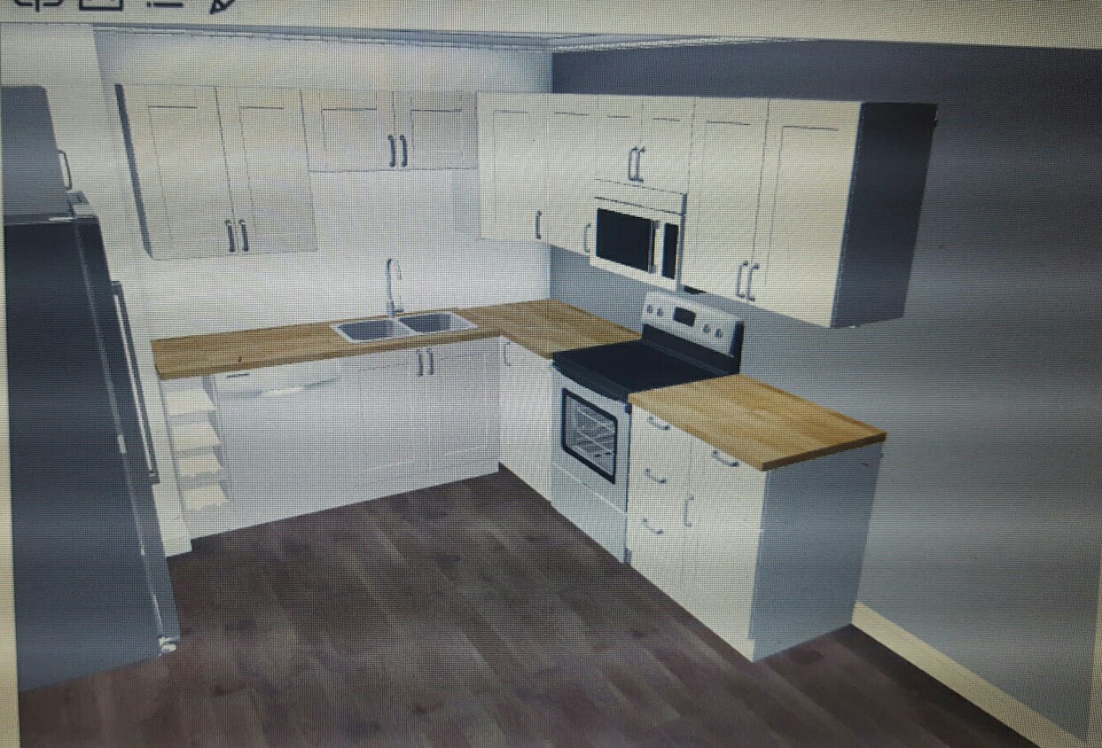 This is the concept design of how the kitchen will look when completed. The new cabinets will arrive in about a week and be installed in the next week or two after arrival. This home will include the appliances, including an over the oven installed microwave.